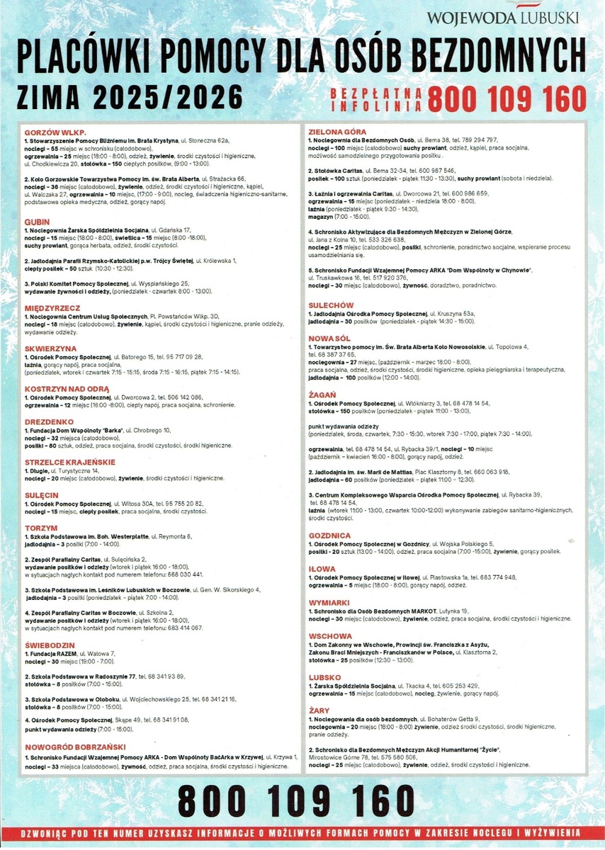 Z dniem 1 listopada 2025 r. w Wojewódzkim Centrum Zarządzania Kryzysowego uruchomiona została całodobowa infolinia dla osób bezdomnych oraz potrzebujących pomocy o numerze: